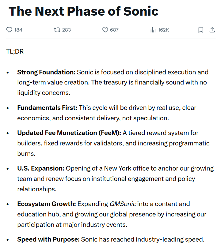 Salı günü X’te paylaşılan bir gönderide Demeter, hedeflerinin geliştiriciler, doğrulayıcılar ve token sahipleri için “ölçülebilir ve kalıcı değer” yaratmak olduğunu söyledi. “Sonic’teki misyonumuz, beklentilerin ötesine geçmek ve ilk aşama için sürdürülebilir bir iş modeli oluşturmaktır: token sahiplerine gerçek değer yaratmak, yakalamak ve iade etmek.”