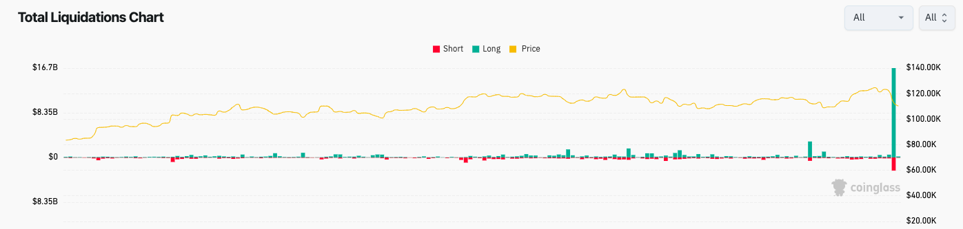 CoinGlass’tan elde edilen veriler, 24 saatlik tasfiyelerin yaklaşık 20 milyar dolara ulaştığını ve uzun pozisyonların büyük çoğunluğu oluşturduğunu gösteriyor.